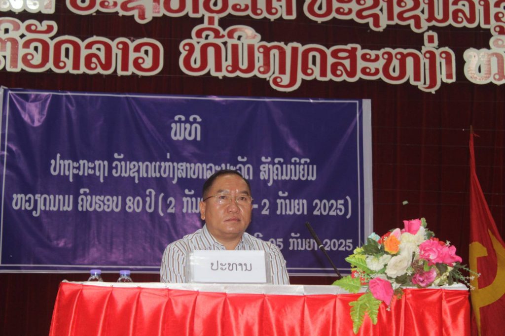 ໃນພິທີ ສະຫາຍ ຮືທໍ່ ເພຍຫຼວງ ກໍາມະການພັກແຂວງ ເລຂາພັກເມືອງ ໄດ້ເລົ່າມູນເຊື້ອຄວາມເປັນມາຂອງວັນຊາດ 2 ກັນຍາ ປີ 1945 ຂອງ ສາທາລະນະລັດ ສັງຄົມນິຍົມ ຫວຽດນາມຄົບຮອບ 80 ປີ, ພາຍໃຕ້ການນຳພາຂອງພັກກອມມູນິດ ແລະ ປະຊາຊົນຫວຽດນາມ ໄດ້ດຳເນີນການປະຕິວັດແຕ່ເດືອນສິງຫາ ເພື່ອຍາດຄືນອຳນາດມາໃຫ້ປະຊາຊົນ ຈົນໄດ້ຮັບໄຊຊະນະຢ່າງຈົບງາມ ໃນວັນທີ 2 ກັນຍາ ປີ 1945, ປະທານ ໂຮ່ຈິມິນ ຖະແຫຼງການປະກາດເອກະລາດ, ໃຫ້ປະຊາຊົນທຸກຊົນເຜົ່າ ແລະໂລກໄດ້ຮັບຮູ້ກ່ຽວກັບການກຳເນີດ ຂອງປະເທດສາທາລະນະລັດ ປະຊາທິປະໄຕ ຫວຽດນາມ ແລະ ປັດຈຸບັນ ກໍ່ແມ່ນປະເທດສາທາລະນະລັດ ສັງຄົມນິຍົມຫວຽດນາມ ນີ້ກໍ່ເປັນຂີດໝາຍອັນລໍ້າຄ່າຂອງປະຫວັດສາດຂອງຊາດຫວຽດນາມ, ໄດ້ນຳພາປະເທດຊາດຫວຽດນາມເຂົ້າສູ່ຍຸກແຫ່ງເອກະລາດ, ເສລີພາບເປັນເຈົ້າຕົນເອງ, ສ້າງຄວາມເຂັ້ມແຂງດ້ວຍຕົນເອງ. ພ້ອມນັ້ນ, ຍັງໄດ້ສະແດງເຖິງ ຜົນສໍາເລັດອັນໃຫຍ່ຫຼວງຫລາຍດ້ານ ທີ່ພັກ – ລັດ ແລະ ປະຊາຊົນ ສສ ຫວຽດນາມ ສາມາດຍາດມາໄດ້ໃນໄລຍະທີ່ຜ່ານມາ, ໂດຍສະເພາະ ອັນຍິ່ງໃຫຍ່ ທີ່ຜ່ານແປວໄຟແຫ່ງສົງຄາມການປະຕິວັດ, ການຕໍ່ສູ້ກູ້ຊາດ, ເພື່ອຜ່ານຜ່າອຸປະສັກນາໆປະການ ຈົນເຮັດໃຫ້ປະເທດຊາດໄດ້ຮັບໄຊຊະນະ ແລະ ສະຖາປະນາເປັນ ສາທາລະນະລັດ ສັງຄົມນິຍົມ ຫວຽດນາມ ໃນປັດຈຸບັນ.