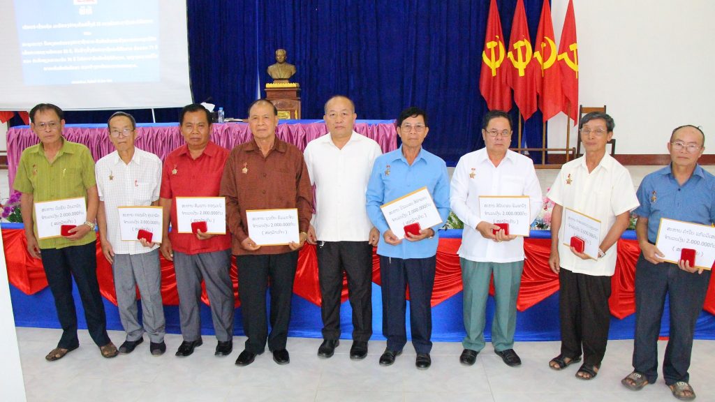 ໃນຕອນທ້າຍພິທີທ່ານ ສຸກສະເຫຼີມ ສົມມະນີ ກໍ່ໄດ້ຂື້ນເຜີຍແຜ່-ເຊື່ອມຊຶມ ມະຕິກອງປະຊຸມໃຫຍ່ຄັ້ງທີ XII ຂອງພັກປະຊາຊົນປະຕິວັດລາວ ພ້ອມທັງໂອ້ລົມຕໍ່ຜູ້ເຂົ້າຮ່ວມ ກ່ອນທີ່ພວກເຮົາຈະມີຜືນແຜ່ນດິນອັນຄົບຖ້ວນໃຫ້ຢຽບຢືນ, ມີເຮືອນຫຼັງໃຫຍ່ໃຫ້ພັກເຊົາ ແລະ ມີຮອຍຍິ້ມໃນຄອບຄົວ, ພວກເຮົາຮູ້ບໍ່ວ່າມີນັກຮົບຜູ້ກ້າຫານຈຳນວນນັບບໍ່ຖ້ວນ ທີ່ໄດ້ເອົາຊີວິດເຂົ້າແລກ, ເອົາເລືອດເນື້ອເຂົ້າທາແຜ່ນດິນ, ບາງສະຫາຍຕ້ອງເສຍແຂນ, ເສຍຂາ, ບາງສະຫາຍສູນເສຍການເບິ່ງເຫັນ ຫຼື ການໄດ້ຍິນຕະຫຼອດຊີວິດ. ພວກເພິ່ນຍອມ “ເສຍອົງຄະ ແຕ່ບໍ່ຍອມເສຍເອກະລາດ”, ຍອມຈາກລູກເມຍທີ່ຮັກແພງໄປສູ່ສະໜາມຮົບທີ່ເຕັມໄປດ້ວຍຄວັນປືນ ໂດຍບໍ່ຮູ້ວ່າມື້ໃດຈະໄດ້ກັບຄືນມາ “ເສຍຫຍັງກໍຍອມເສຍໄດ້ ແຕ່ຈະບໍ່ຍອມເສຍຊາດຂາຍແຜ່ນດິນໃຫ້ໃຜເດັດຂາດ” ນີ້ຄືສັດຈະປະຕິຍານທີ່ດັງກ້ອງຢູ່ໃນຫົວໃຈຂອງທະຫານລາວທຸກສະຫາຍໃນສະໄໝນັ້ນ. ບາງຄົນໄດ້ກັບມາຫາຄອບຄົວພ້ອມກັບຮ່າງກາຍທີ່ບໍ່ສົມປະກອບ, ບາງຄົນກໍເຫຼືອໄວ້ພຽງແຕ່ຊື່ ແລະ ຄຸນງາມຄວາມດີໃຫ້ຄົນຮຸ່ນຫຼັງໄດ້ຈົດຈຳ “ຍ້ອນມີພວກເພິ່ນໃນວັນນັ້ນ, ຈຶ່ງມີພວກເຮົາໃນວັນນີ້.” ກໍ່ຍ້ອນມີພັກນໍາພາ, ມີຜູ້ເສຍສະຫຼະເພື່ອຊາດໃນການປະຕິບັດສອງໜ້າທີ່ຍຸດທະຊາດກໍ່ຄືການປົກປັກຮັກສາແລະ ສ້າງສາພັດທະນາປະເທດຊາດ ຈື່ງມີການເຕີບໃຫຍ່ຂະຫຍາຍຕົວຂື້ນເທື່ອລະກ້າວ ແລະ ໃນໂອກາດນີ້ກໍ່ໄດ້ມອບຫຼຽນກາລະນຶກ 70 ປີ ໃຫ້ພະນັກງານນັກຮົບຜູ້ທີ່ມີຜົນງານມີຄຸນງາມຄວາມດີແກ່ປະເທດຊາດຈຳນວນ 72 ທ່ານ,ຍິງ 04 ທ່ານ.